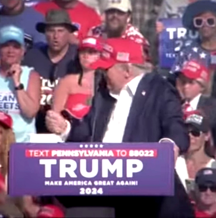 The only evidence I have found of the reality of this near miss, grazing event, is this one photo which, miraculously, captures a whizzing bullet somewhere in proximity to Trump's head. This cannot, however, be the bullet that grazed him. Why? In studying the video, at the exact moment when this photo was taken, it quickly becomes apparent that at this exact moment Trump was reaching for his ear. Yet, the bullet is too close to his head for his body position, ergo his hand to have been drawn approximately 15 cm upwards towards his ear and the grimace beginning to appear on his face after having allegedly been struck by a passing bullet.